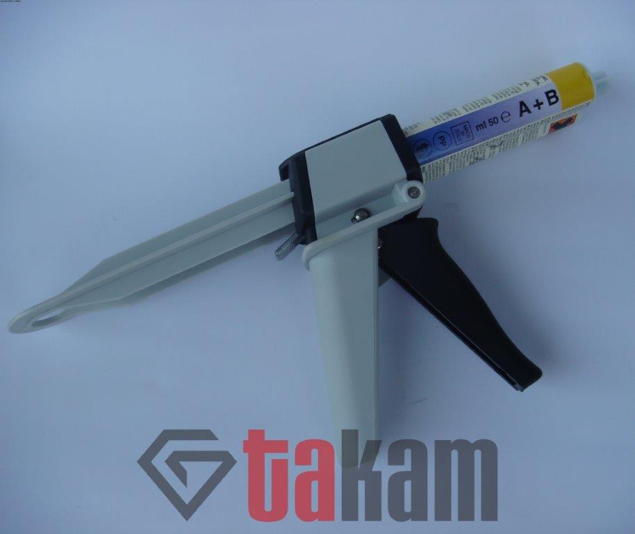Żywica i katalizator są automatycznie dozowane i mieszane podczas wyciskania z podwójnej tuby za pomocą pistoletu i mieszane w specjalnej wymiennej końcówce zwanej mikserem.